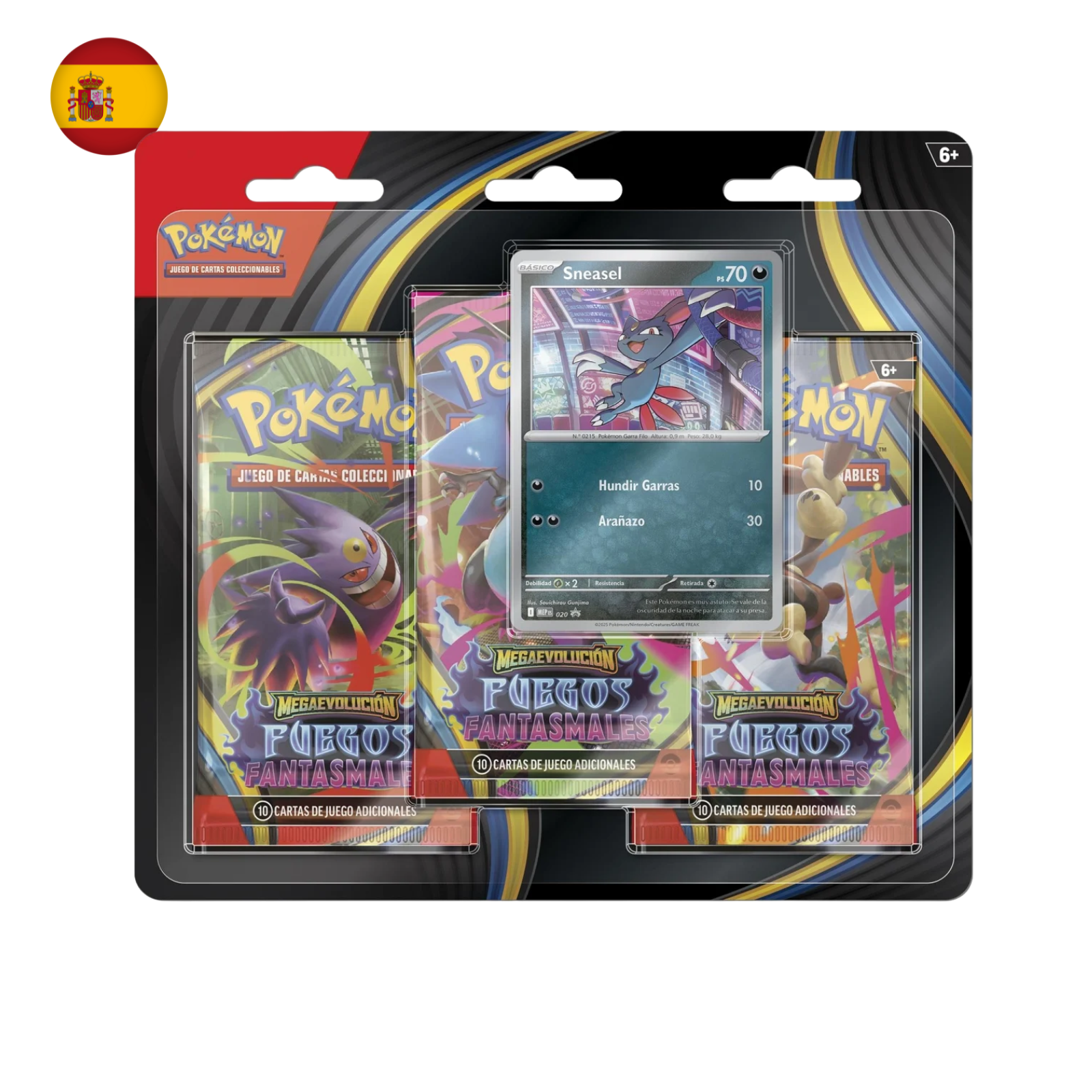 Disponibles blisters de la colección Fuegos Fantasmales, uno con la carta promocional de Sneasel y otro con la de Weavile. Cada blister incluye 3 sobres de refuerzo de la expansión Megaevolución – Fuegos Fantasmales del JCC Pokémon. Cada sobre contiene 10 cartas, 1 Energía Básica y un código para JCC Pokémon Live (el contenido puede variar entre sobres).